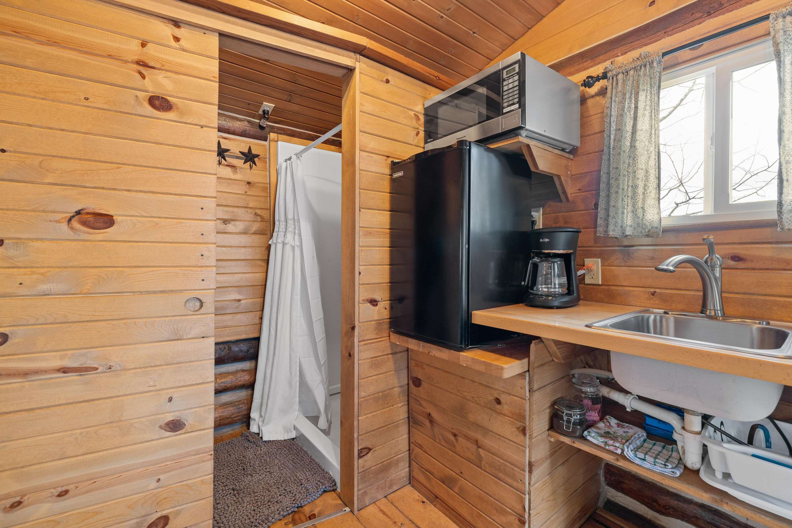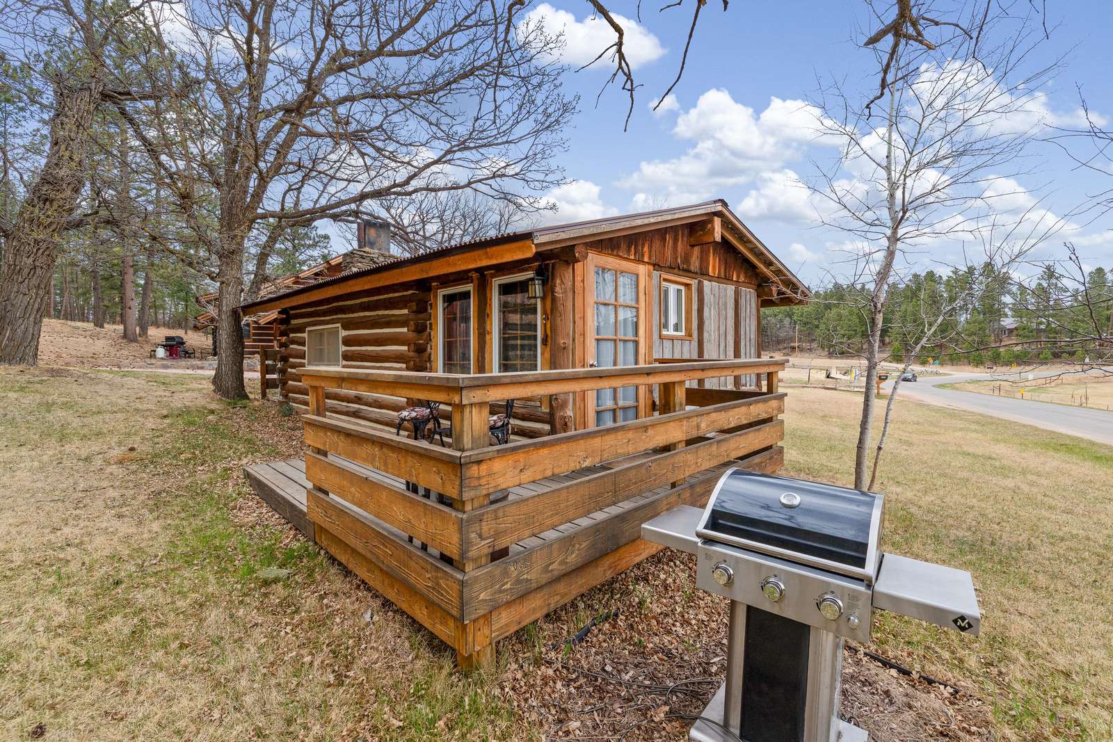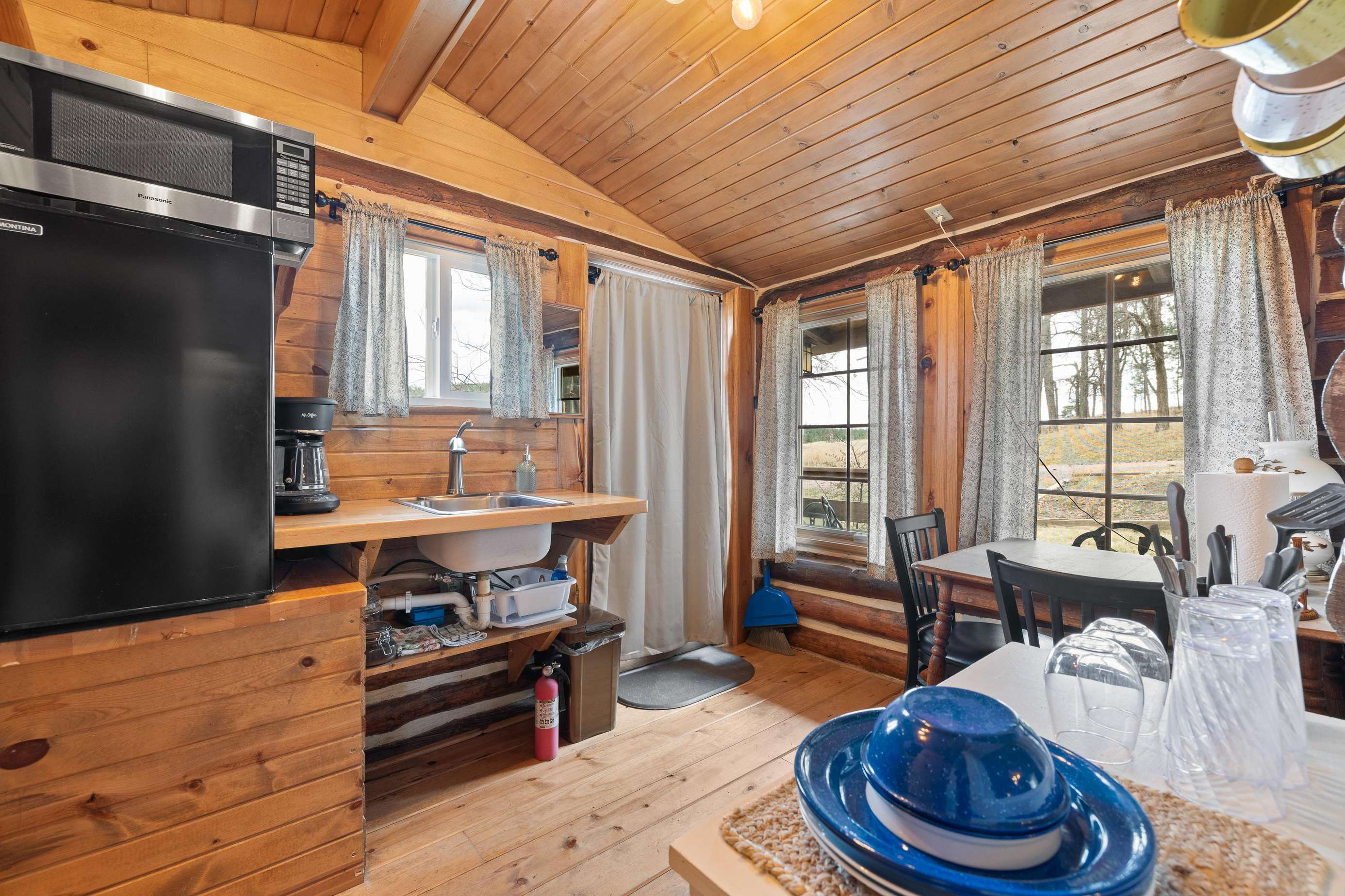 The Calamity Jane is an open floor plan which sleeps 3 people. It has a king-size bed and a twin bed. A kitchenette and small bath were added to the original cabin. (The old outhouse still stands nearby; we use it as a gardening shed.) The kitchenette includes a sink, microwave, mini fridge, toaster, drip coffeemaker, and an induction hot plate. We stock the kitchenette with pots, pans, basic cooking and eating utensils. We include dishes, drinking glasses, basic spices, and a limited amount of coffee and filters. A small bath with a walk-in shower and toilet. There is also a kitchen table with two chairs, as well as a dining table with four chairs near the fireplace. There is a 32" Roku TV in the main cabin. We use Starlink satellite internet for our WiFi. Outside there is an all-cedar deck with a small table, 2 chairs, and BBQ grill for outdoor enjoyment.