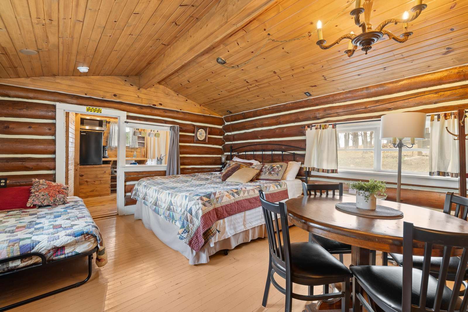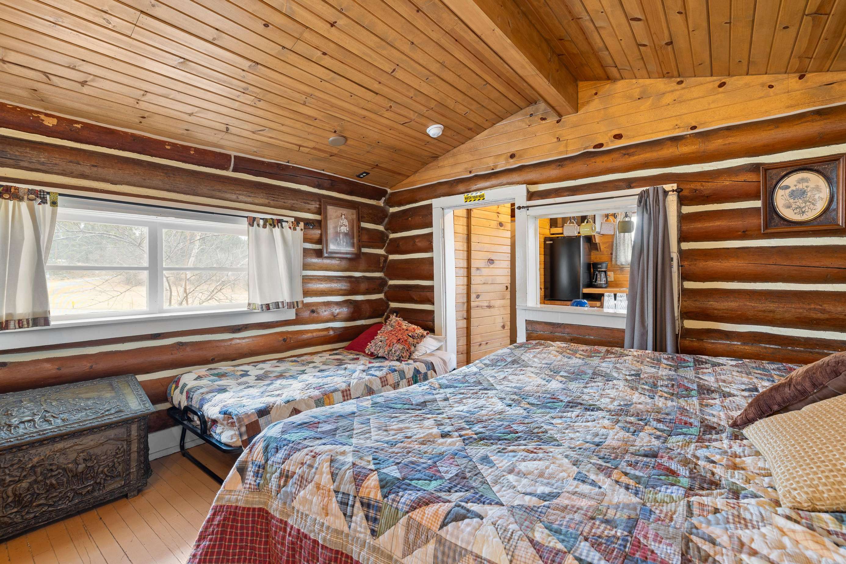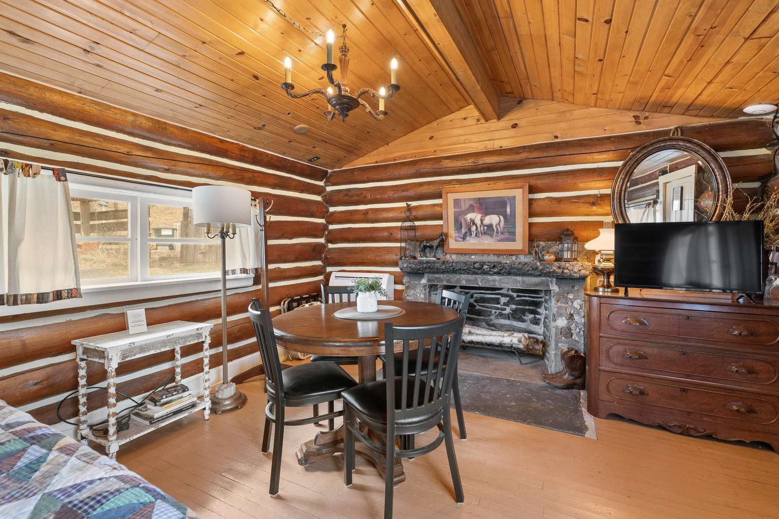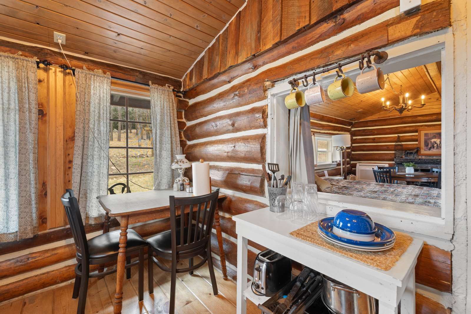 The Calamity Jane is an open floor plan which sleeps 3 people. It has a king-size bed and a twin bed. A kitchenette and small bath were added to the original cabin. (The old outhouse still stands nearby; we use it as a gardening shed.) The kitchenette includes a sink, microwave, mini fridge, toaster, drip coffeemaker, and an induction hot plate. We stock the kitchenette with pots, pans, basic cooking and eating utensils. We include dishes, drinking glasses, basic spices, and a limited amount of coffee and filters. A small bath with a walk-in shower and toilet. There is also a kitchen table with two chairs, as well as a dining table with four chairs near the fireplace. There is a 32" Roku TV in the main cabin. We use Starlink satellite internet for our WiFi. Outside there is an all-cedar deck with a small table, 2 chairs, and BBQ grill for outdoor enjoyment.