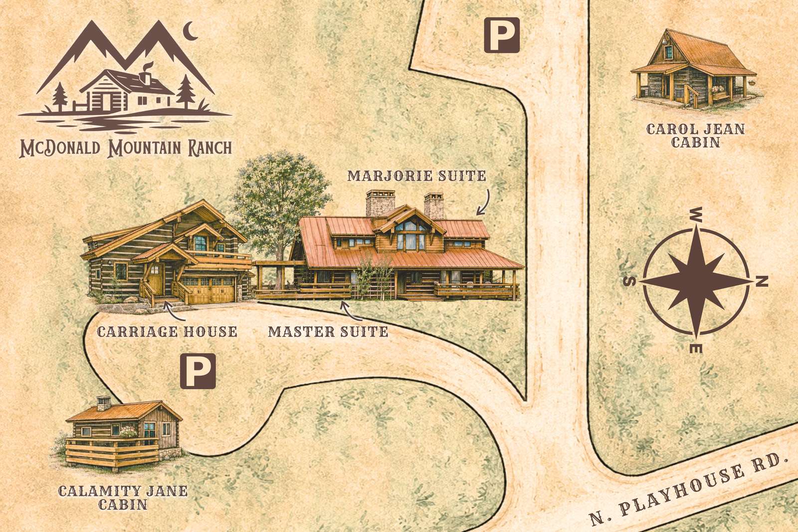 Driving and Parking Info: The Ranch is located directly off of a well-maintained and paved county road. Our driveways are hard-packed dirt and gravel. We have limited parking near each of the cabins and suites. We have an additional parking area at the rear of the main lodge. We have a large, well-kept meadow beyond that for overflow parking of motorcycle trailers, side by sides, etc. We ask that you please do not block the main driveways or the two-car garage at the front of the property.