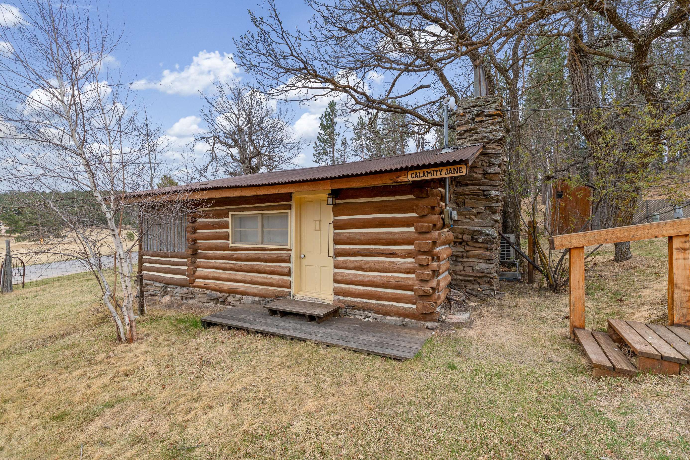 The Calamity Jane cabin is an authentic, historic log home with the original wood floor, main door, and historic rock fireplace. (Due to its historical nature, the fireplace is non-functioning.) The cabin got its name because Calamity Jane herself spent an evening in the cabin while traveling through the hills back in the day. The cabin was used at various times for stage coach travelers, a guest house, and to house the school teacher for the nearby mining town of Spokane. Its authenticity has kept alive the spirit of its age, bringing its visitors back to a more simple and romantic age of mankind. A hand stacked rock fireplace, (historical and therefore non-functioning), is the central feature of this genuine historic log building.