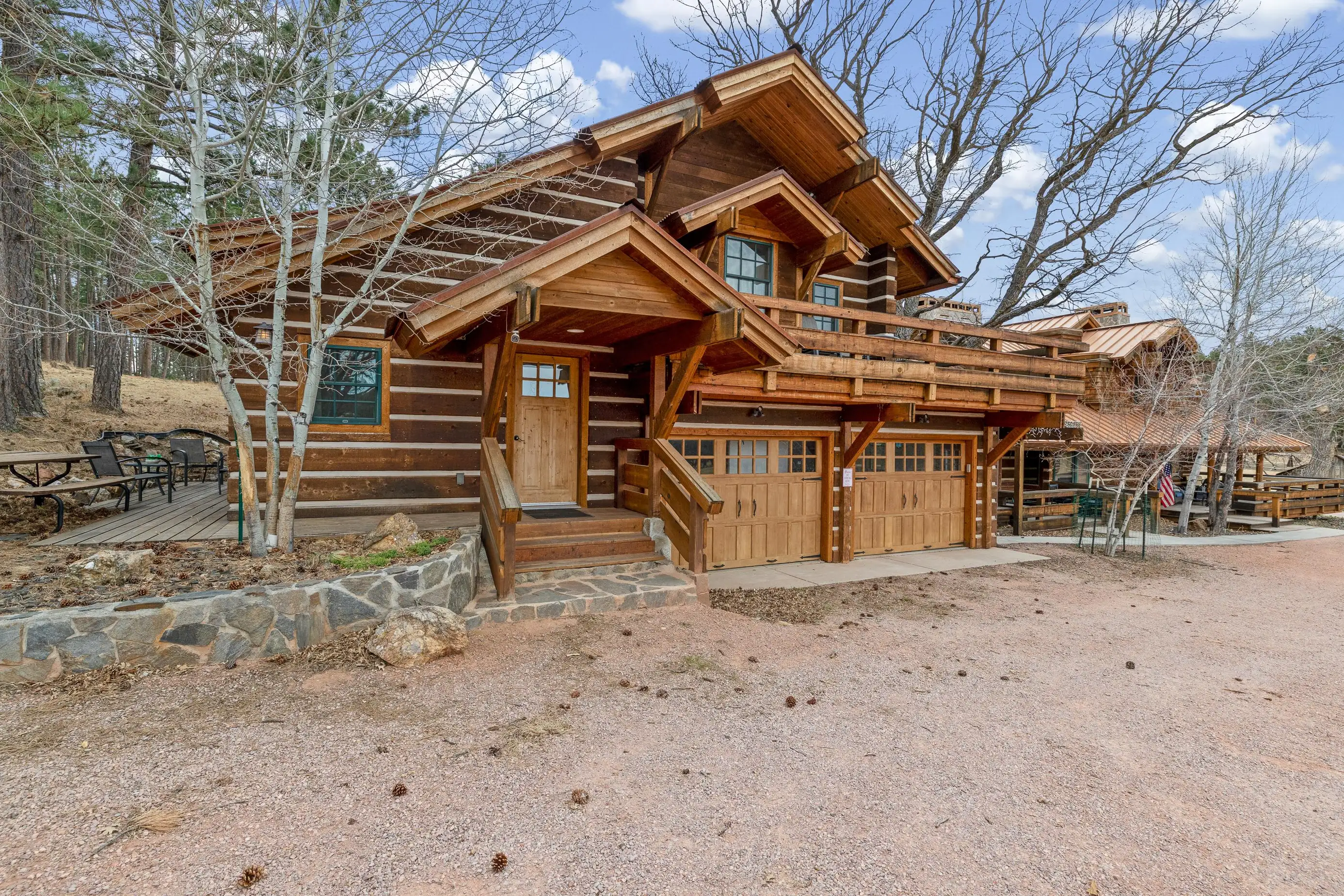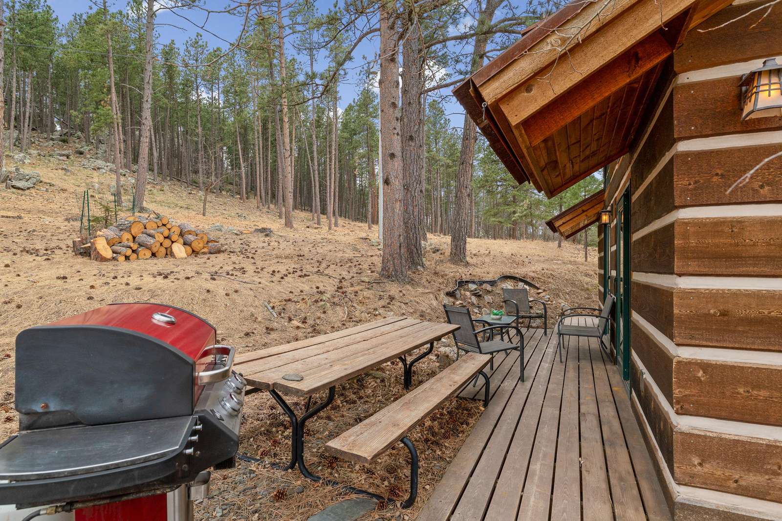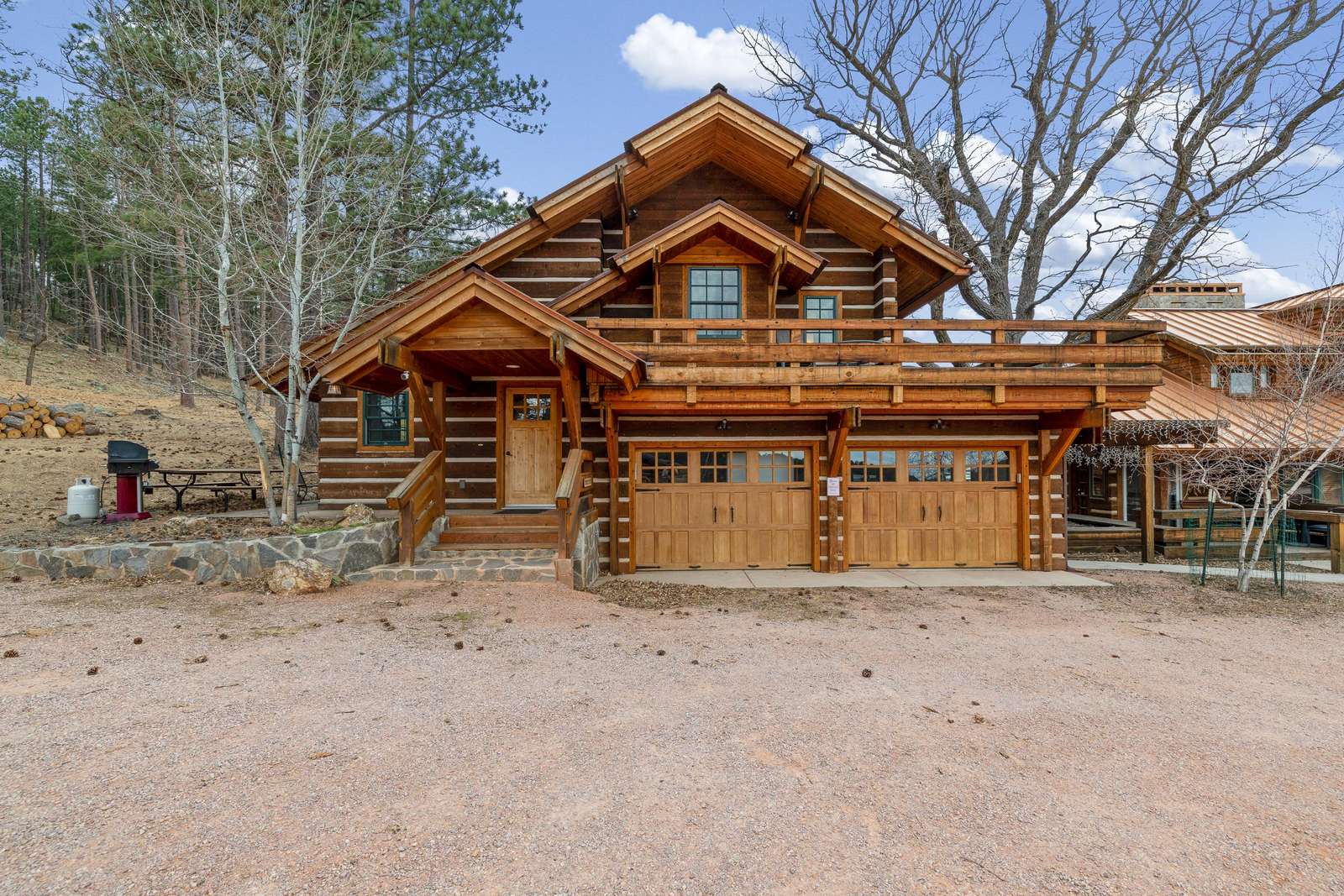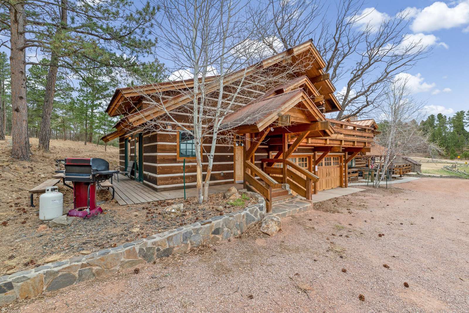 Escape to The Carriage House—an 800 sq ft mountain log lodge cabin with two baths, wraparound decks, stunning meadow & mountain views, full kitchen, Wi-Fi, washer/dryer, and space for up to four guests near Mt. Rushmore.