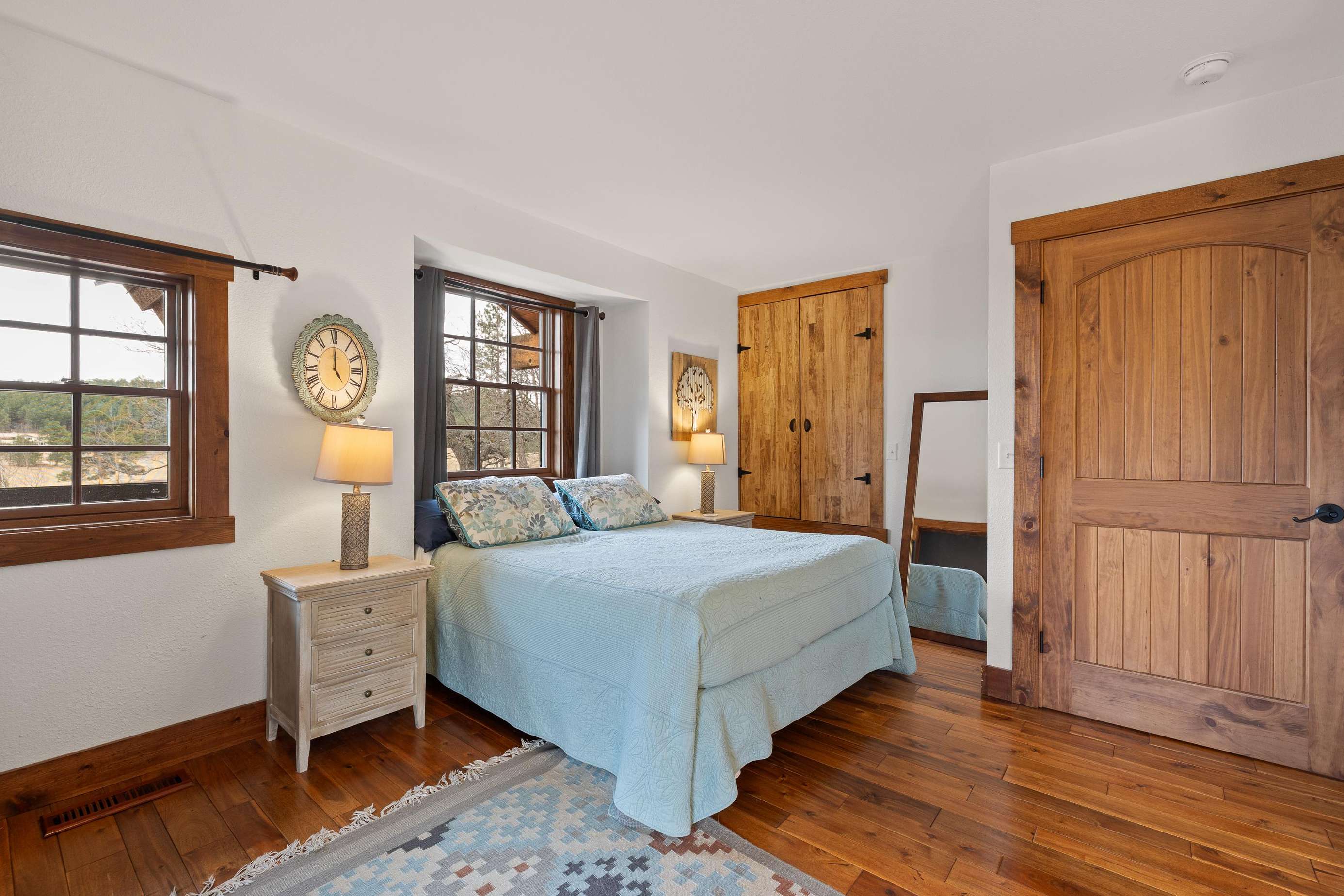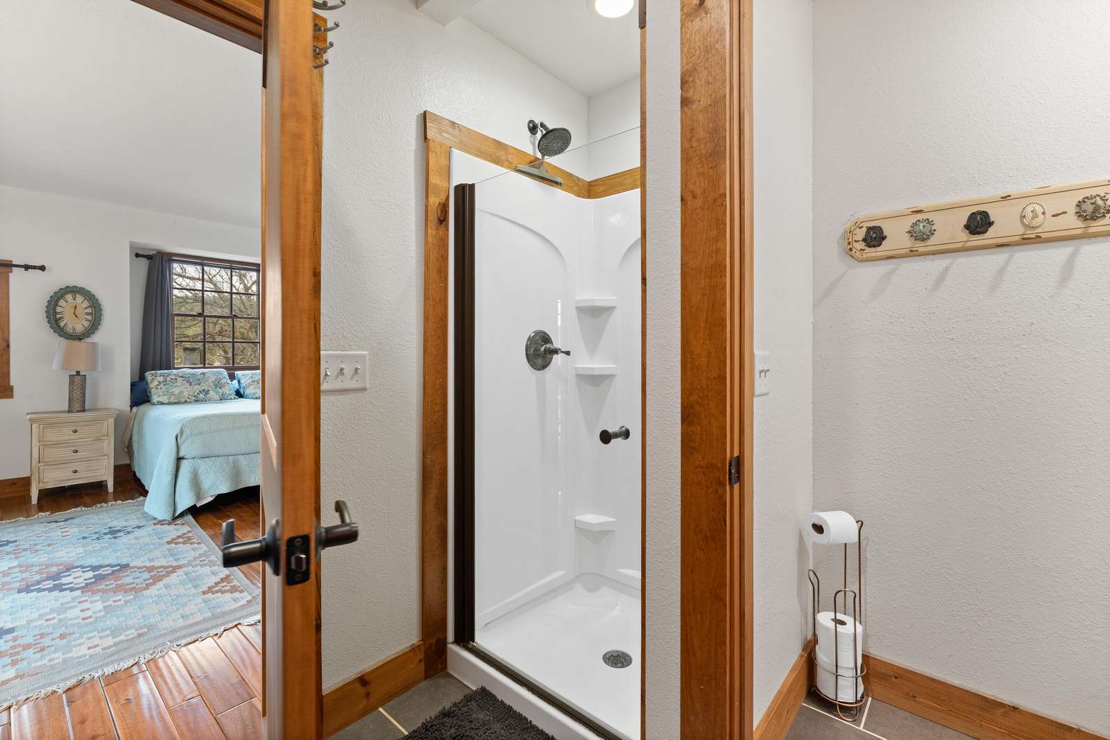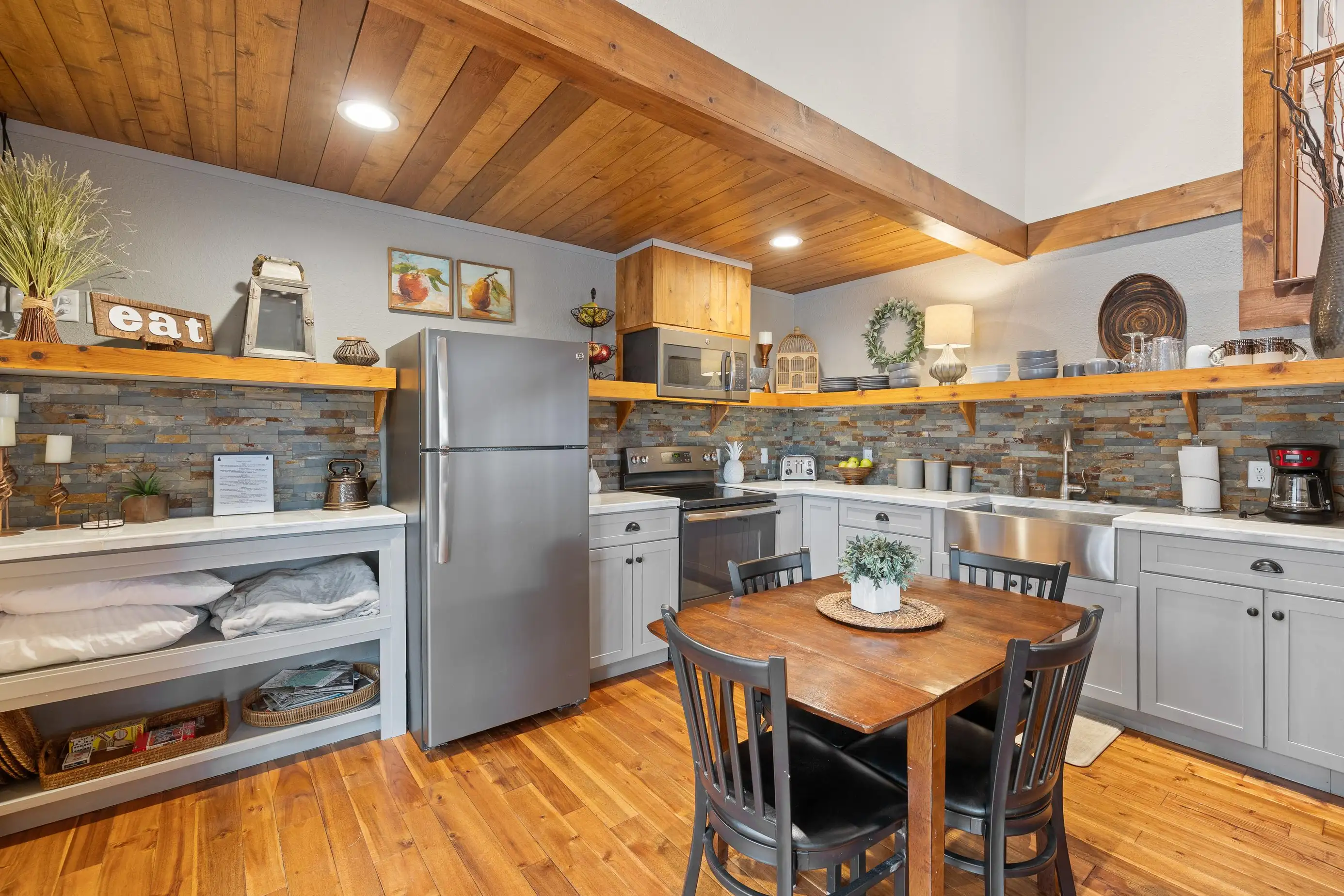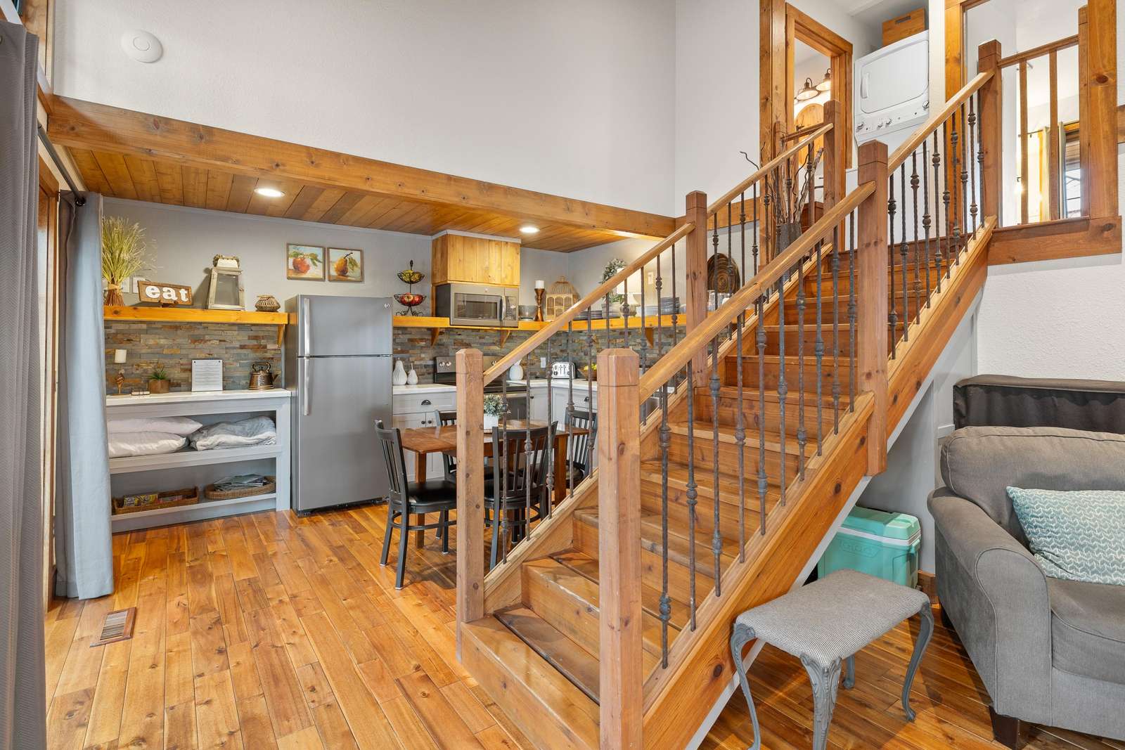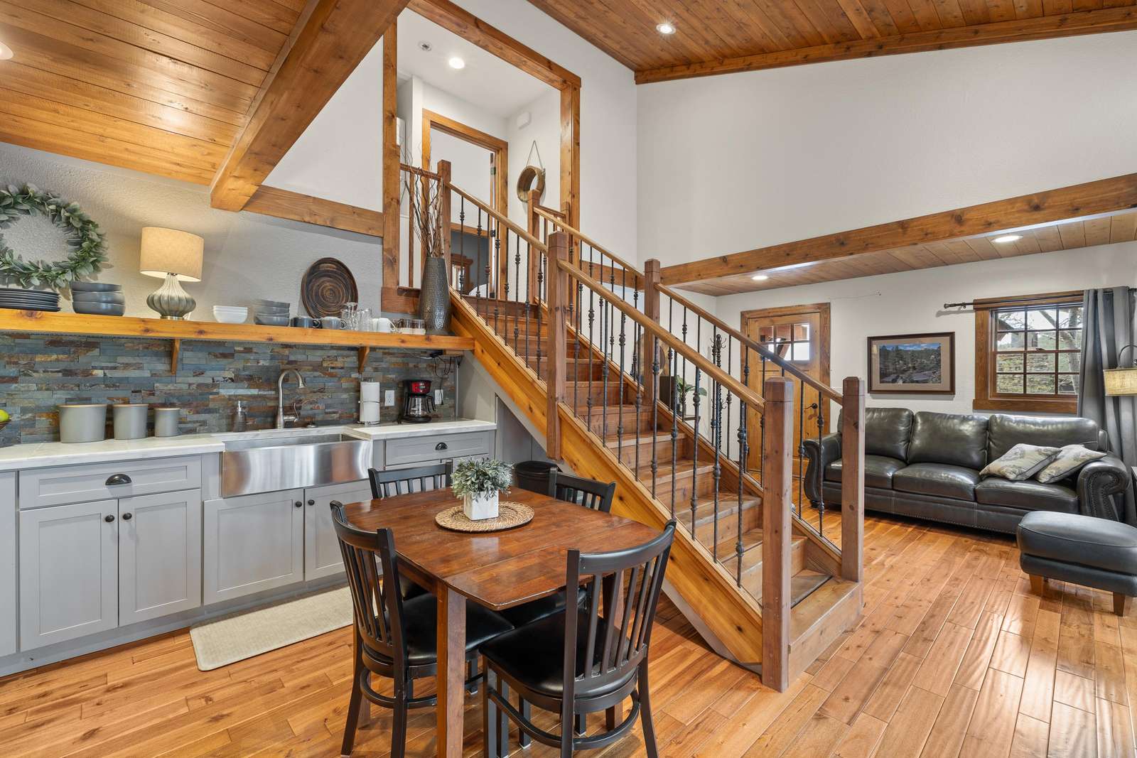The Carriage House is a One Bedroom, two level, two Bath, 800 square-foot cabin with over 300 square-feet of deck on both levels. The Carriage House was designed by the McDonald family in the “mountain log lodge vernacular”. (Please note both bathrooms are located on the 2nd floor, upstairs.) The first floor has a full kitchen, dining area, and a convertible living room that includes a high end queen sized sofa sleeper. We also have two twin size roll away beds available upon request. These two roll-away beds can be added to the lower or upper levels. The second floor has a full bathroom which includes a shower / tub combo, located at the top of the stairs. The second floor also includes the master bedroom, with a separate full bath with a walk in shower, two sink vanity area, and water closet. The master has a queen bed with high end bedding. There is an entrance from the master suite out to a beautiful wrap around redwood deck which has chairs and a spectacular view of the mountains and meadows.