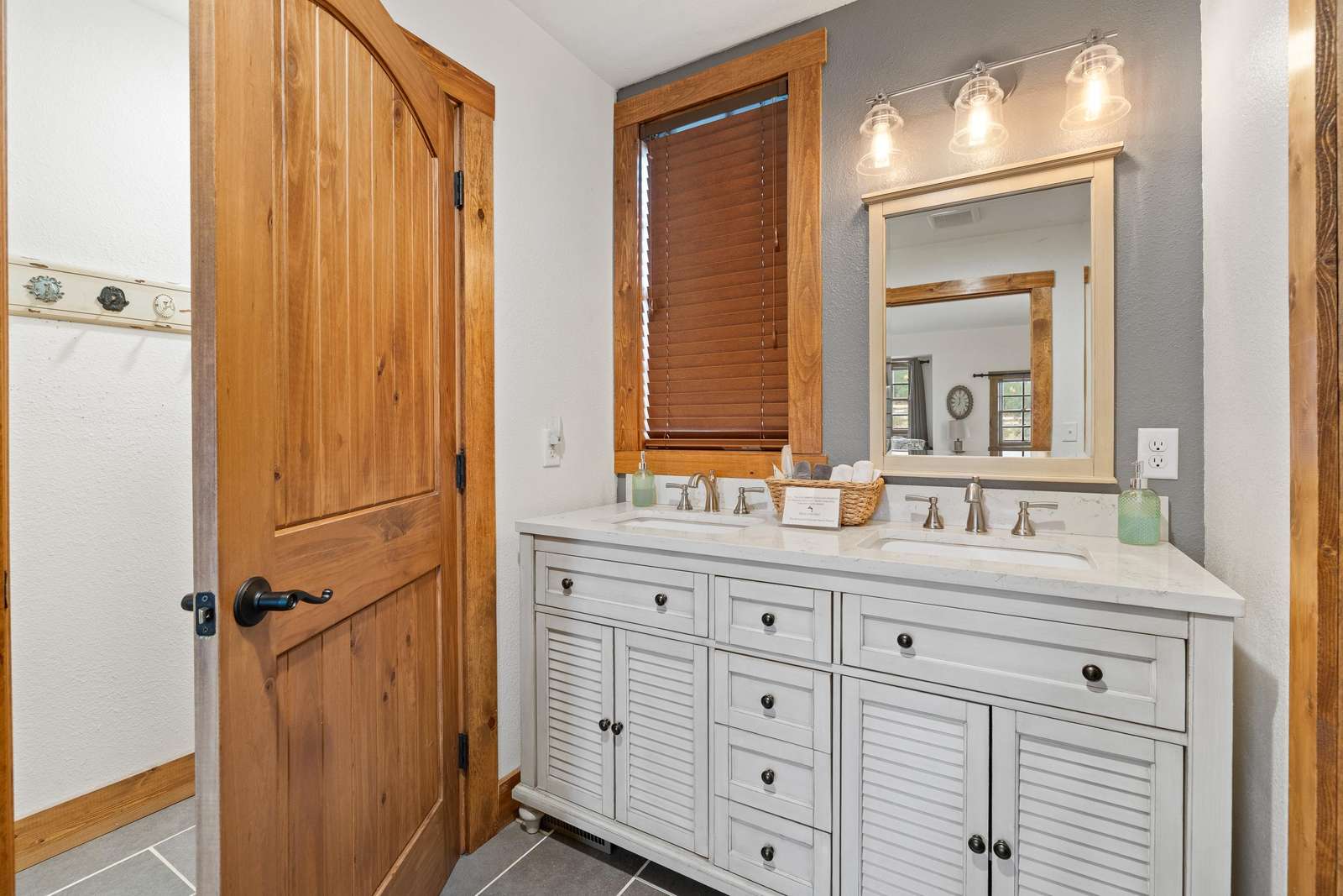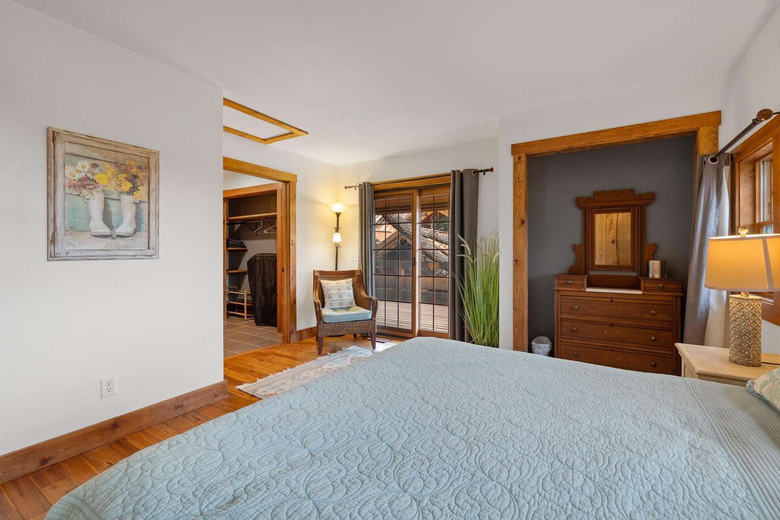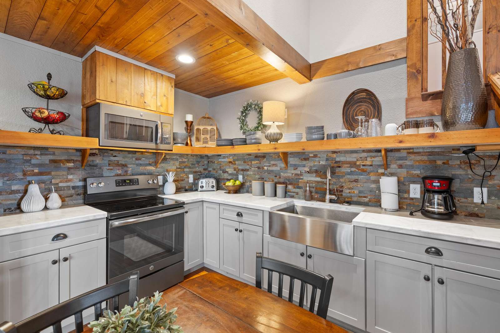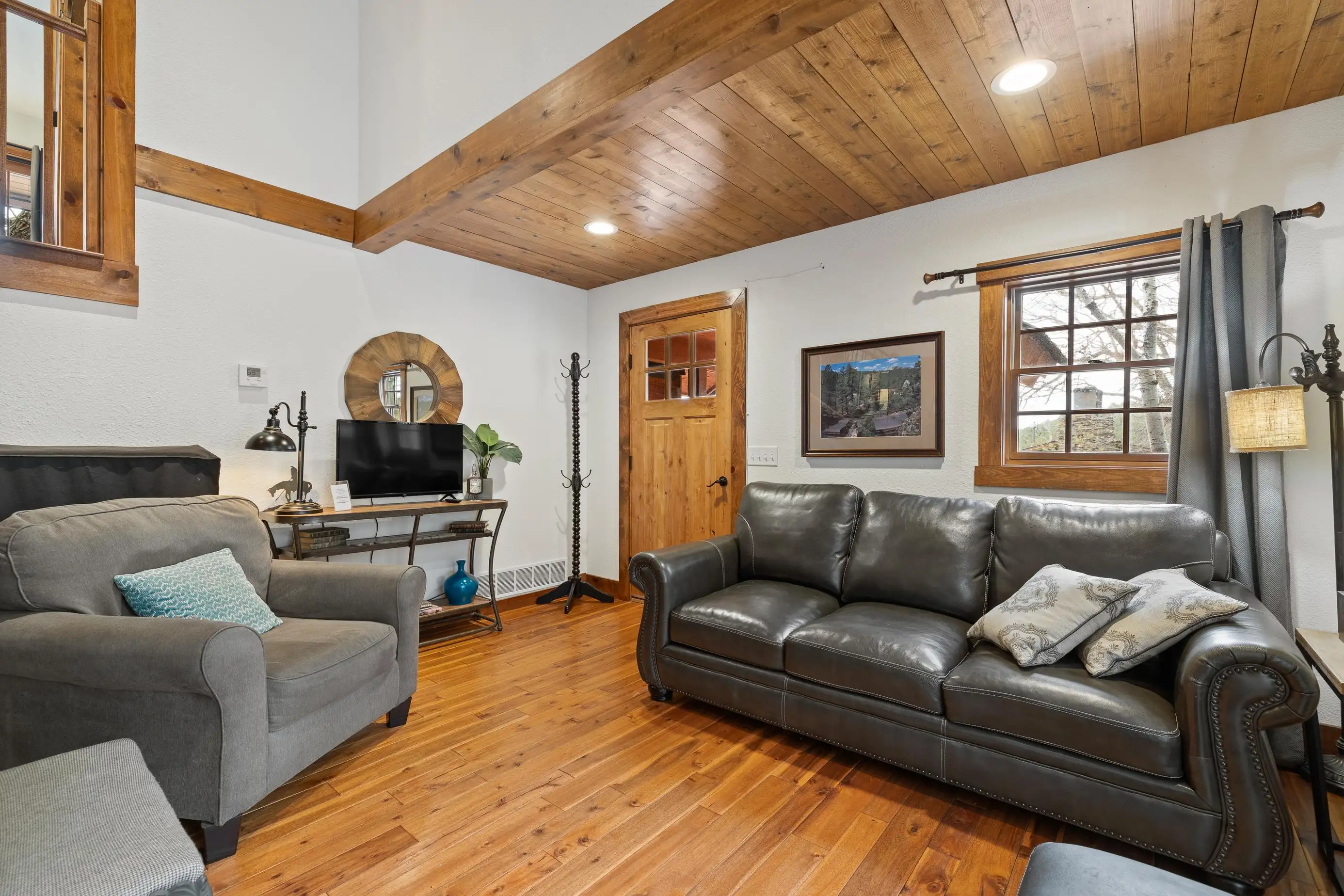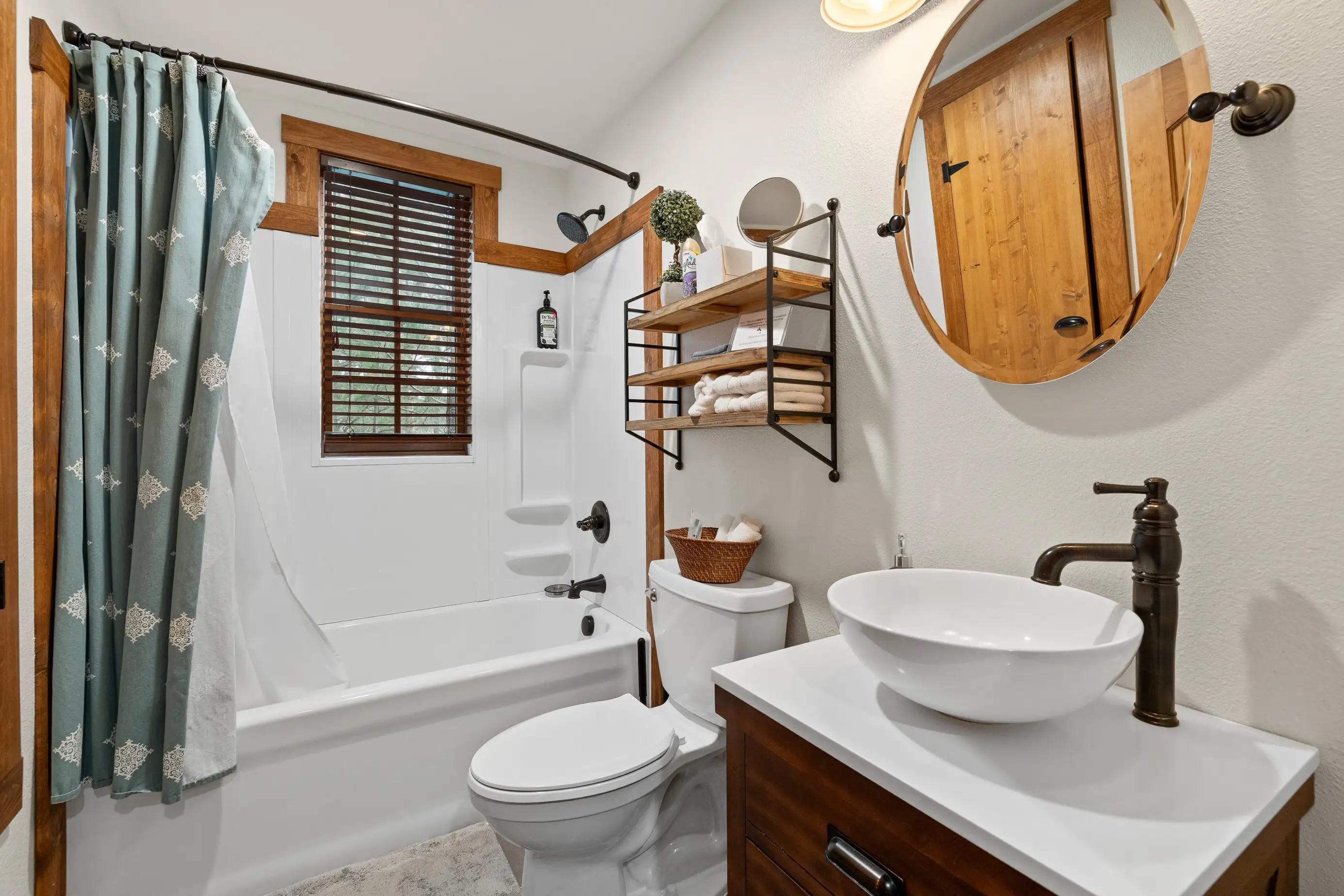 The Carriage House is a One Bedroom, two level, two Bath, 800 square-foot cabin with over 300 square-feet of deck on both levels. The Carriage House was designed by the McDonald family in the “mountain log lodge vernacular”. (Please note both bathrooms are located on the 2nd floor, upstairs.) The first floor has a full kitchen, dining area, and a convertible living room that includes a high end queen sized sofa sleeper. We also have two twin size roll away beds available upon request. These two roll-away beds can be added to the lower or upper levels. The second floor has a full bathroom which includes a shower / tub combo, located at the top of the stairs. The second floor also includes the master bedroom, with a separate full bath with a walk in shower, two sink vanity area, and water closet. The master has a queen bed with high end bedding. There is an entrance from the master suite out to a beautiful wrap around redwood deck which has chairs and a spectacular view of the mountains and meadows.